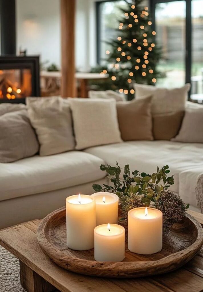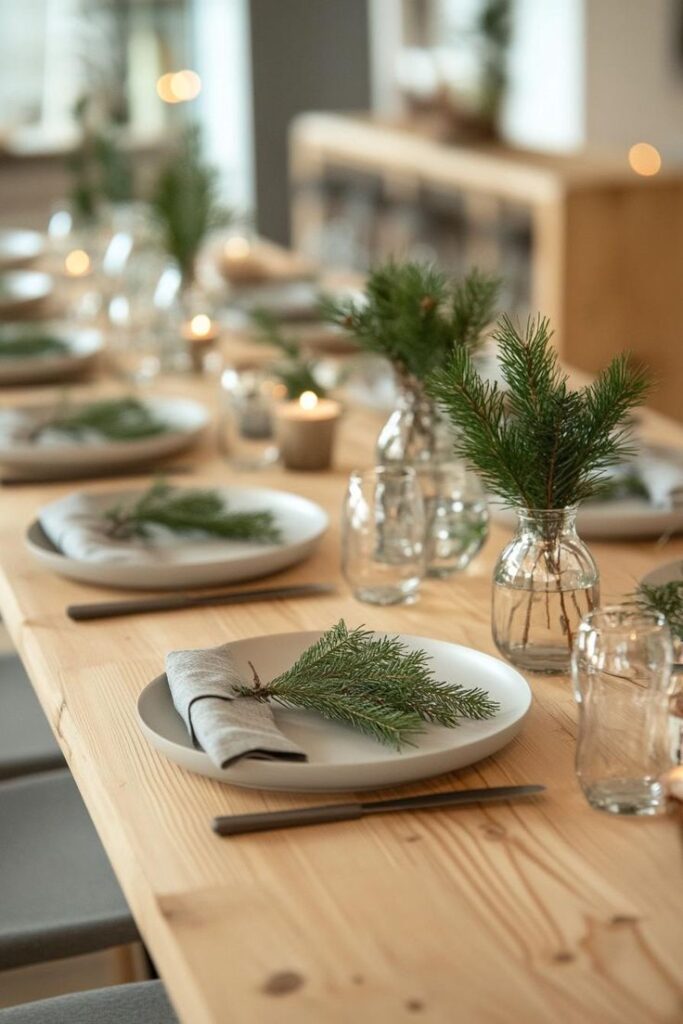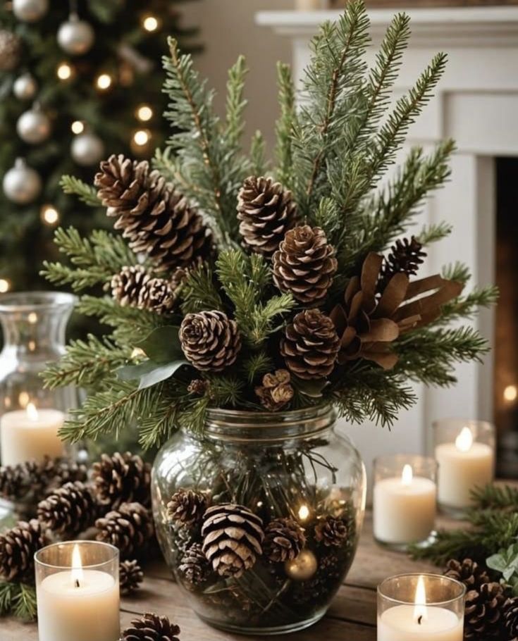 - Centerpiece: Create a centerpiece that’s both easy and stunning. Arrange fresh pine branches with white pillar candles and scatter a few pinecones for texture. It’s low-key festive and smells amazing!