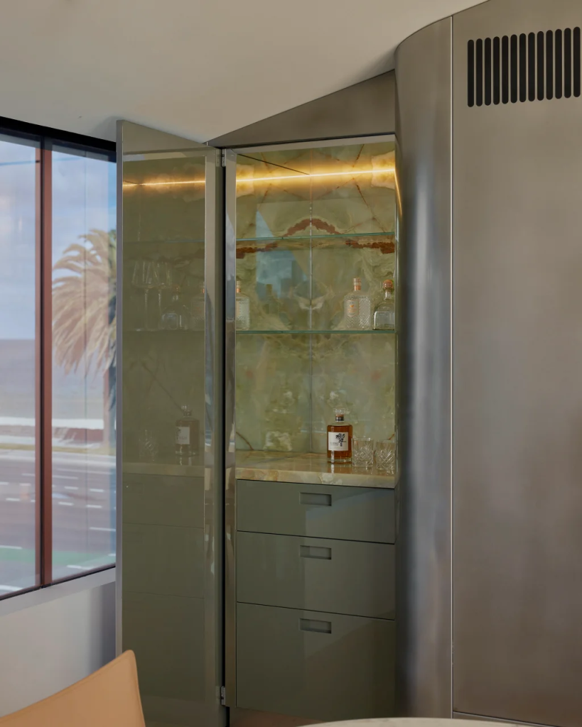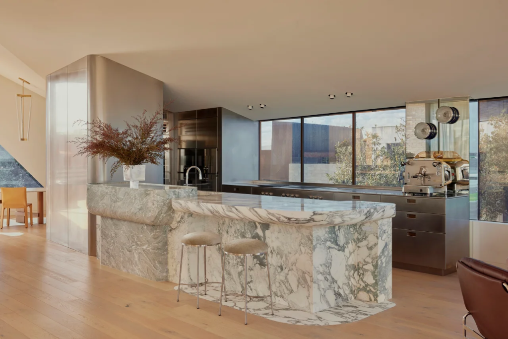 Let’s talk about that kitchen. The centerpiece is an island you can’t ignore. Made from stacked slabs of Arenbescato, Brescia Green, and Menta marble, it’s sculptural, dramatic, and honestly, a little jaw-dropping. It sits on a steel frame that had to be craned into the space. This isn’t your average stone bench. Sleek stainless steel cabinetry wraps around it, offset by bronze finger pulls that add just the right amount of warmth and contrast. It’s functional, yes, but it’s also a piece of art.