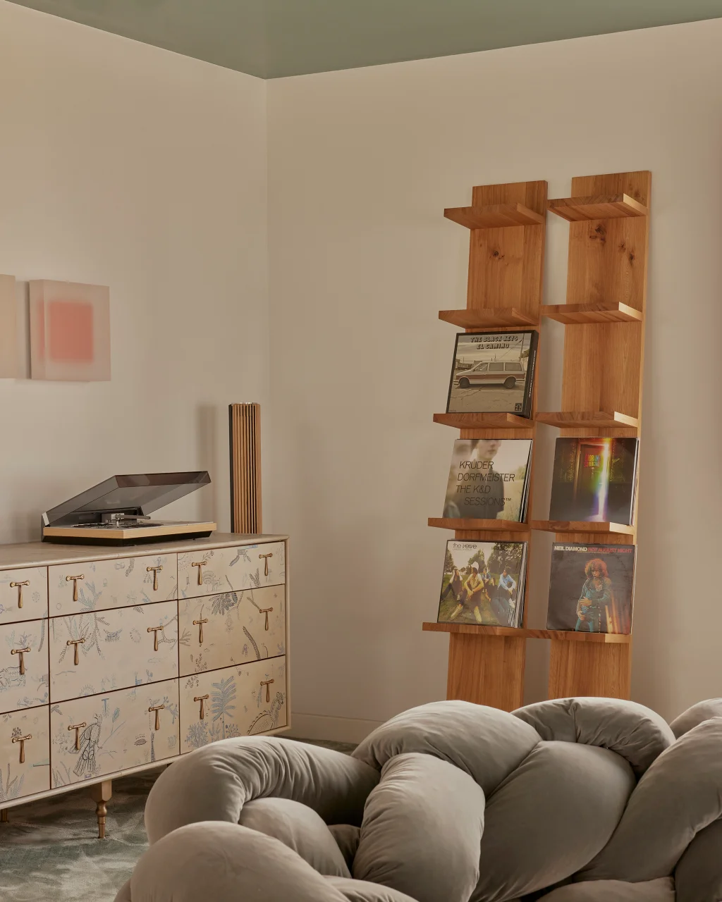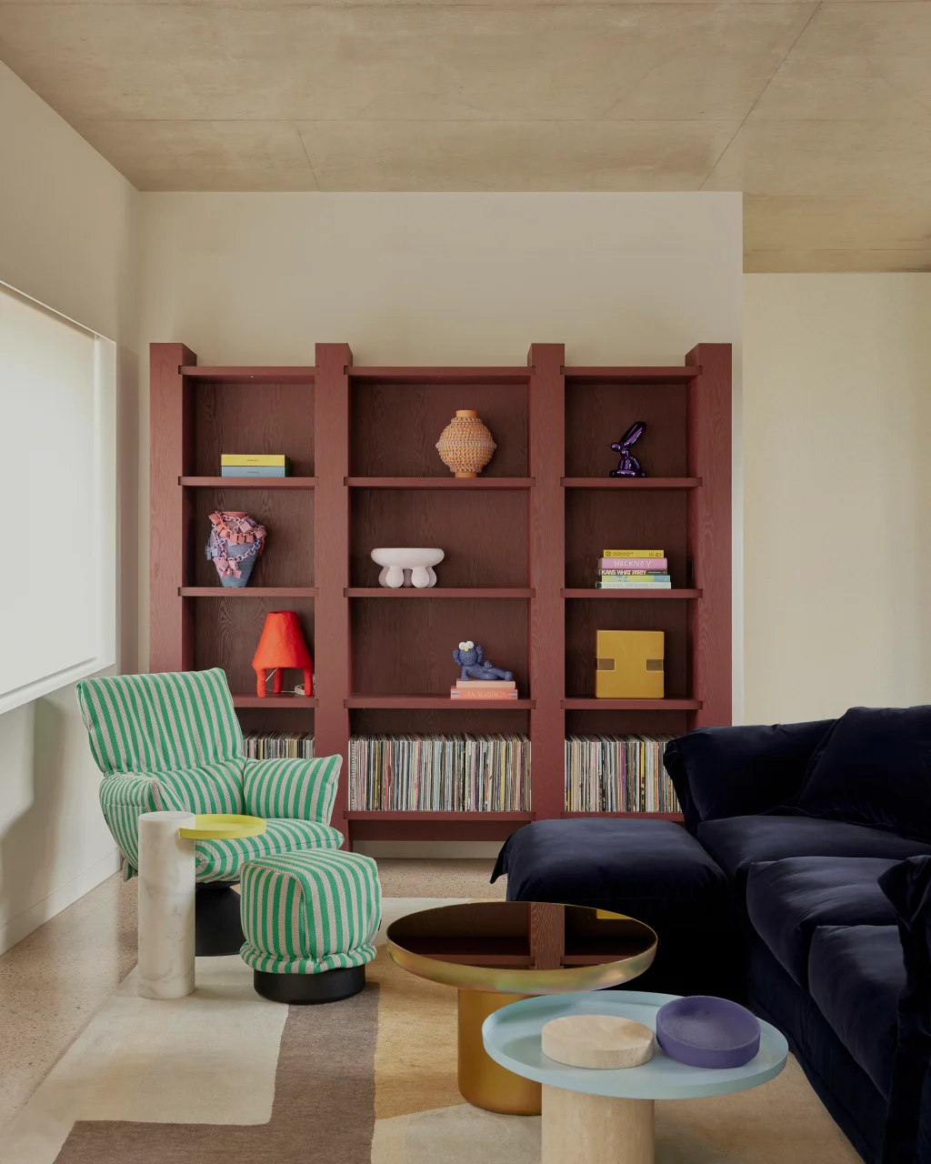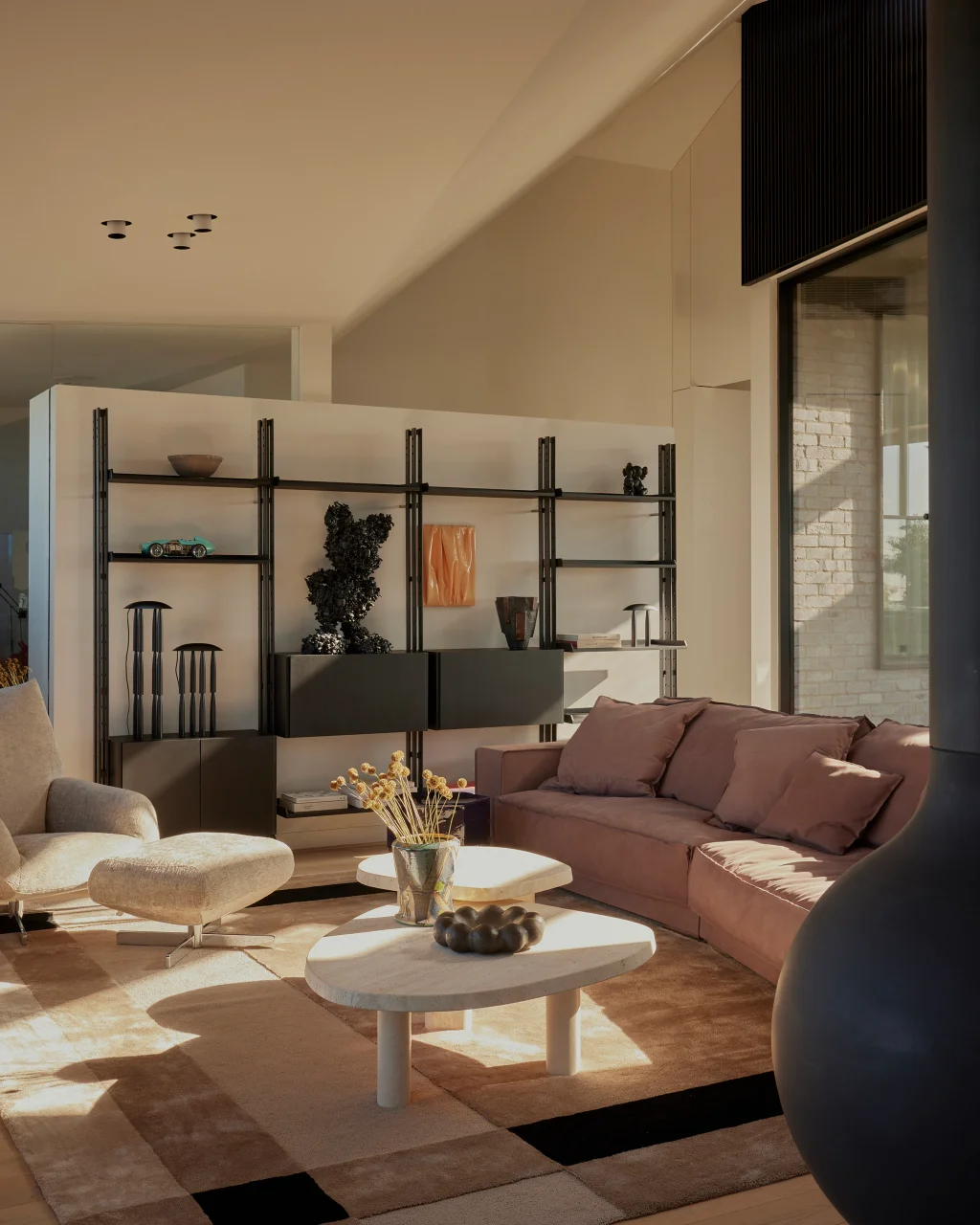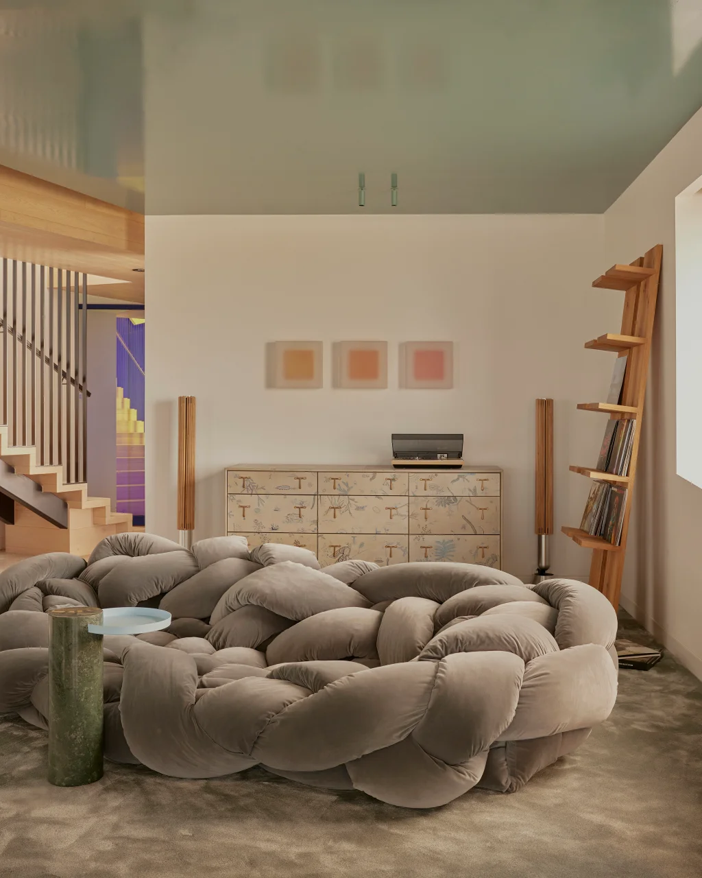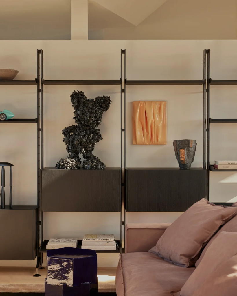 The ground floor doesn’t just serve as the family hangout. It’s a true chameleon. What was once a tucked-away TV room has been reimagined into an open-plan space that’s part music lounge, part playroom, and part cocktail spot. A previously awkward column has been transformed into a standout feature, clad in reflective stainless steel that adds polish and light. The space feels tactile and fun, thanks to a silk rug shaped like a pebble and the curvy, oversized Boa Sofa by Edra, a statement piece that invites you to curl up and stay awhile.