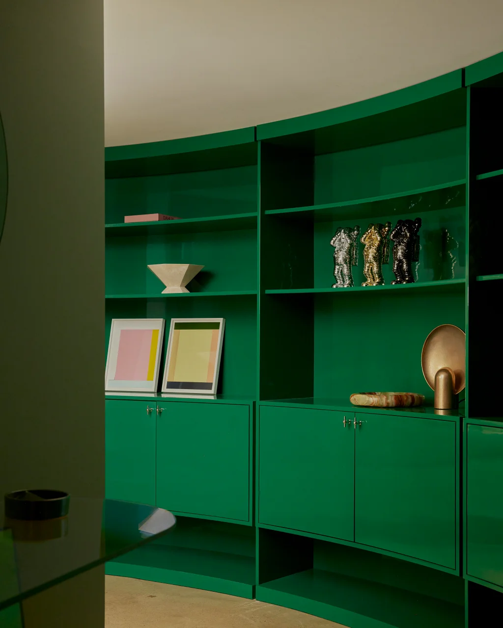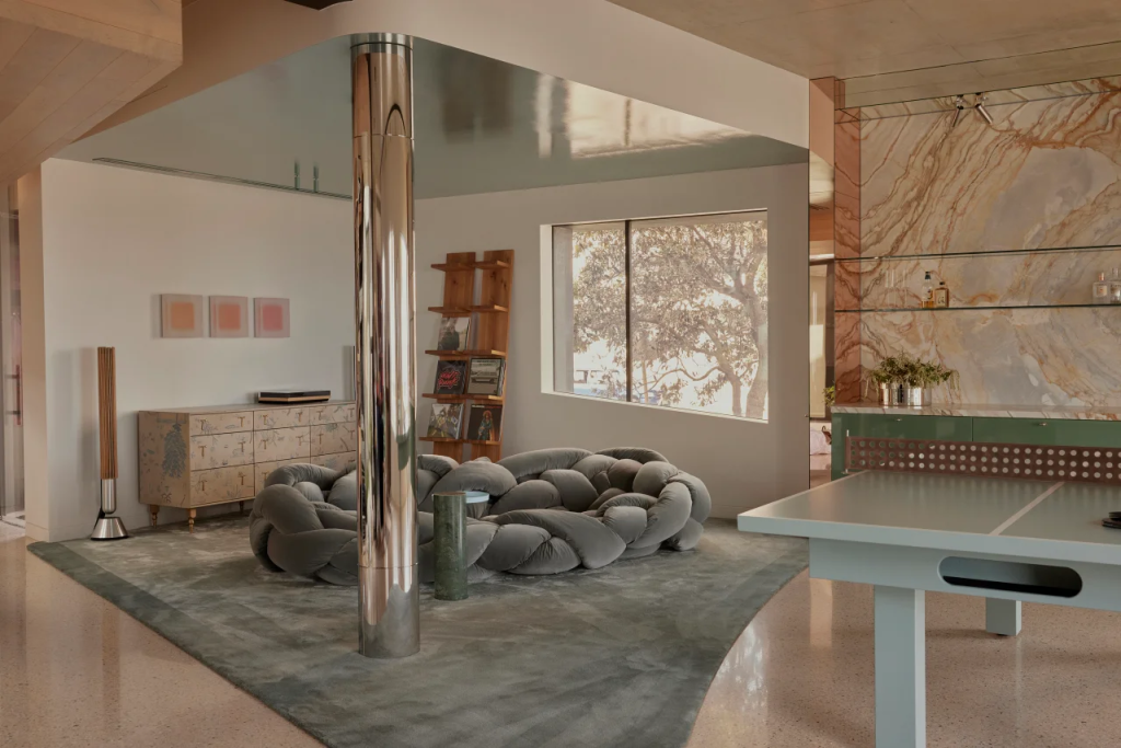 And then there’s the pool table. But not just any pool table. It’s finished in high-gloss green lacquer and cleverly doubles as a ping pong table. Nearby, a bar lined in Calacatta Romano marble and framed with bronze-tinted mirror turns game night into something a little more luxe.
