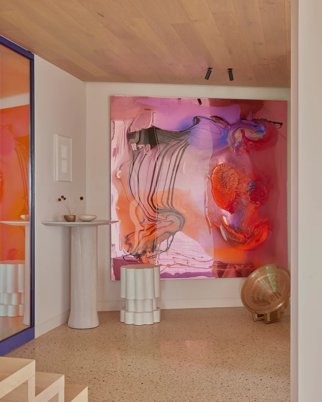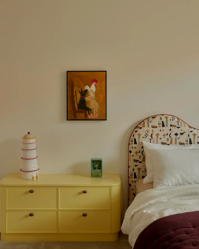 Art and styling in Panorama House are just as carefully curated as the layout. Sally Caroline pulled from her SC Collection to furnish the space, incorporating pieces like Lunetta stools around the kitchen island and a standout artwork titled “Albert” in the living room. Each room finds its rhythm between bold accents and neutral grounding. The entryway might burst with color, but turn the corner into the laundry or main bedroom, and everything settles into calm, quiet tones.