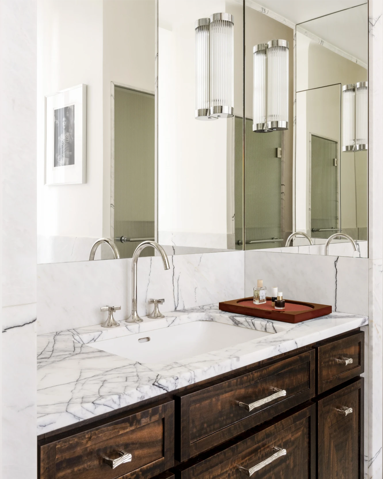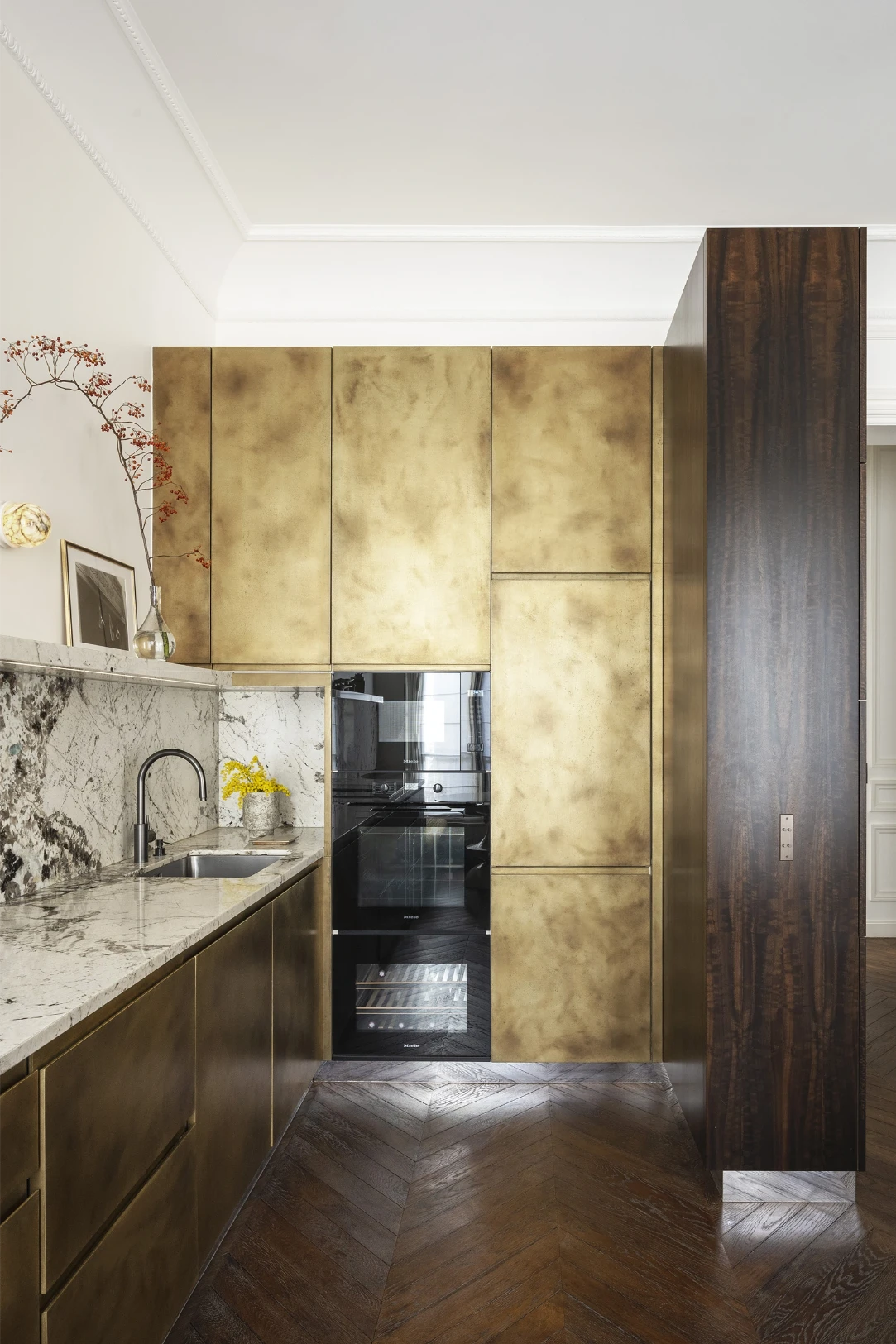 The kitchen is a masterclass in mixing materials. Custom eucalyptus wood cabinets (yes, eucalyptus!) meet sleek marble countertops, and the whole look is tied together with metallic finishes. This balance of warm, natural tones with high-end finishes makes the space feel luxurious yet inviting.