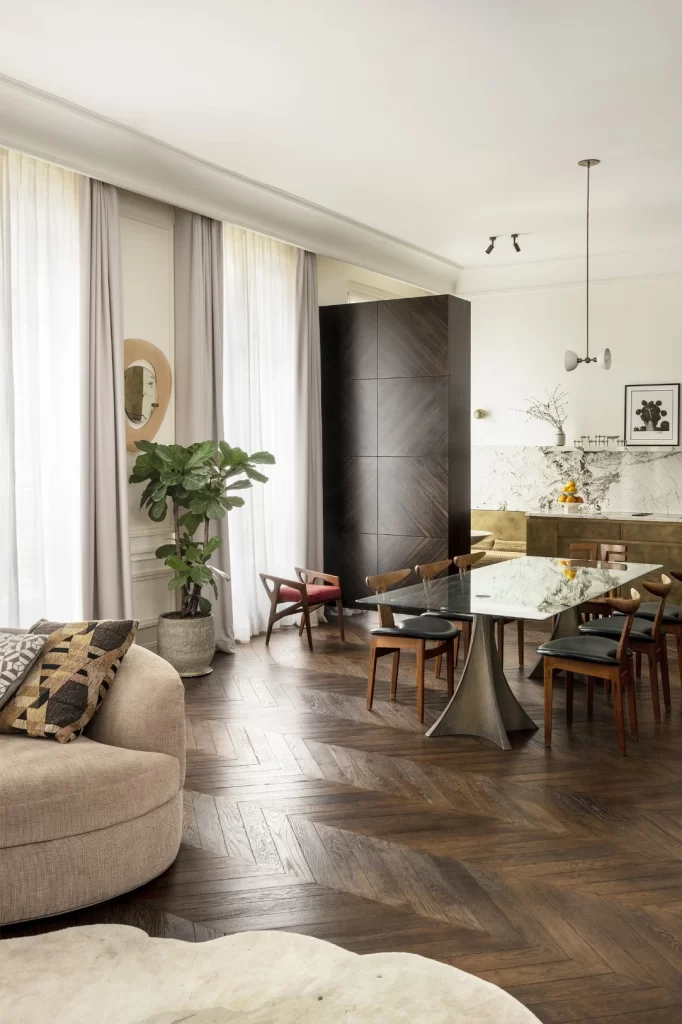 Dora’s approach is all about blending old and new. She kept the apartment’s original character—those gorgeous moldings and architectural details—while layering in contemporary elements that make it feel fresh and livable. It’s proof that modern design doesn’t have to mean stripping away history.