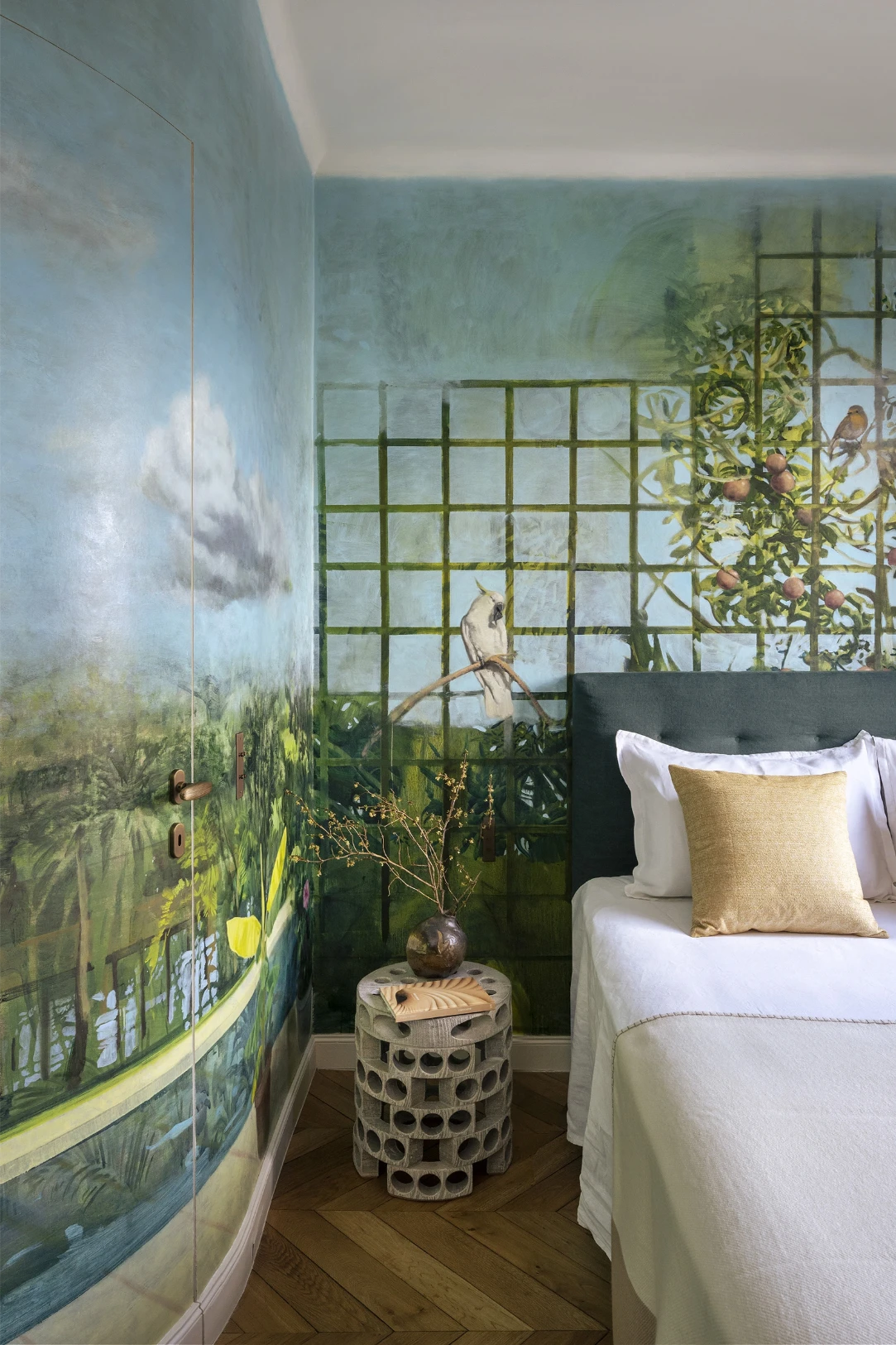 Now, let’s talk about the guest bedroom. Dora commissioned artist Yann Lacroix to paint a stunning mural of cockatiels and peach trees. It’s bold, it’s colorful, and it completely transforms the space.