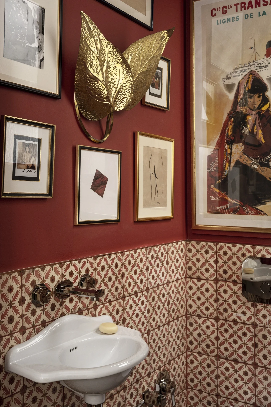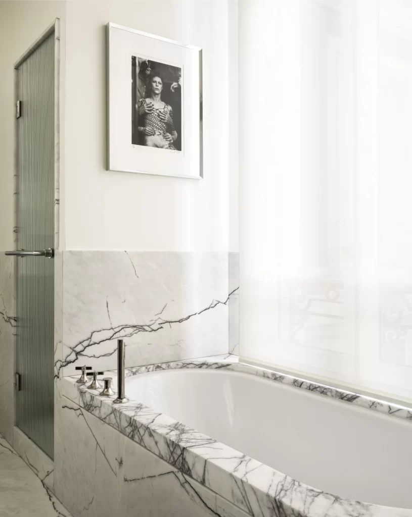 One of the coolest details? Dora took inspiration from the nearby Arc de Triomphe, and you can see that influence in the plasterwork and the intricate tile patterns in the guest bathroom. It’s a subtle way to bring in a sense of place without being too literal or theme-y.
